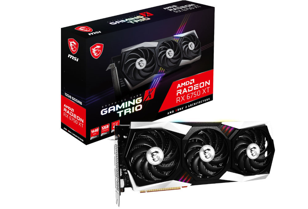 MSI Radeon RX 6750 XT Gaming X Trio — це високоякісна відеокарта з 12 ГБ пам'яті, яка задовольнить очікування найвимогливіших користувачів. Ця карта підтримує DirectX 12 Ultimate, OpenGL 4.6.