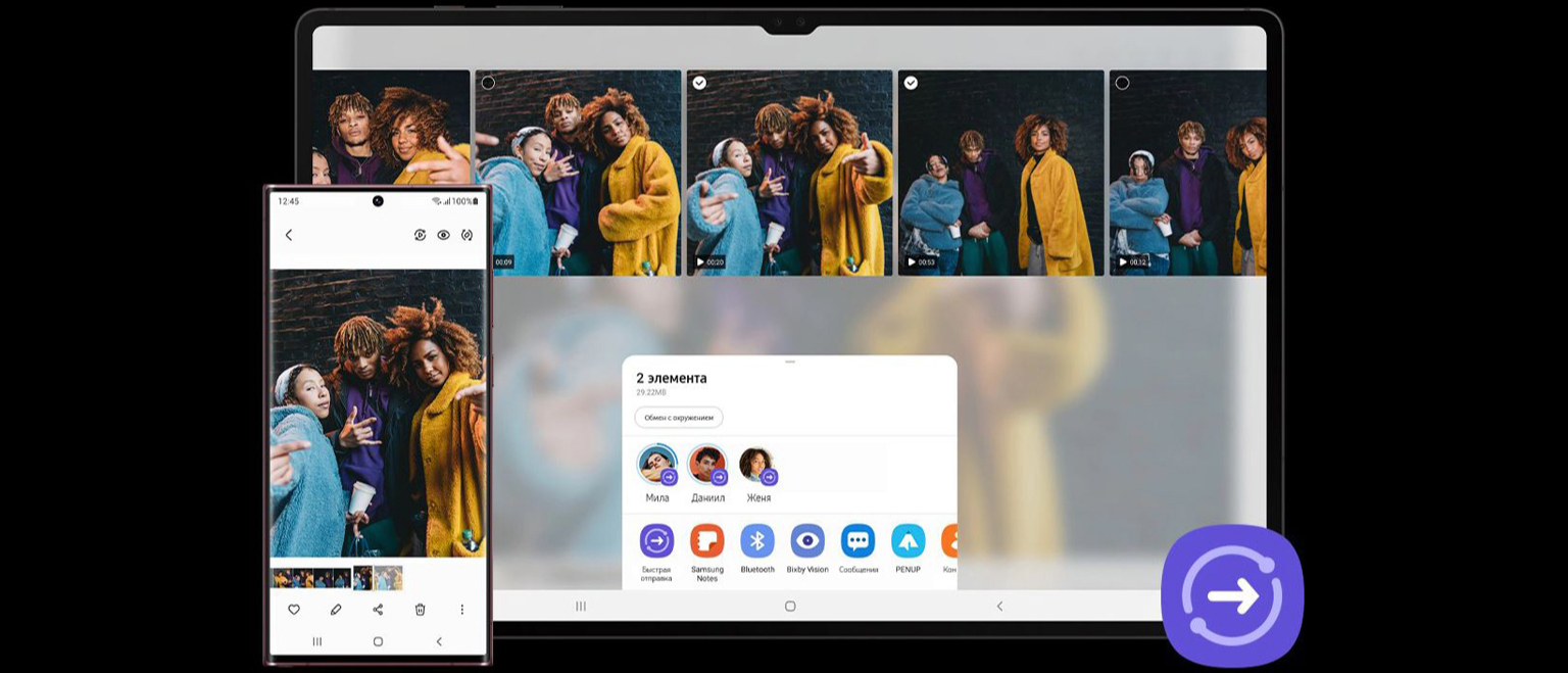 *Доступно на пристроях з One Ui 2.1 або новіше та вимагає оновлень MDE Service Framework і Quick Share. Потрібне з'єднання Bluetooth Low Energy і Wi-Fi. Деякі застосунки можуть не підтримувати Quick Share.